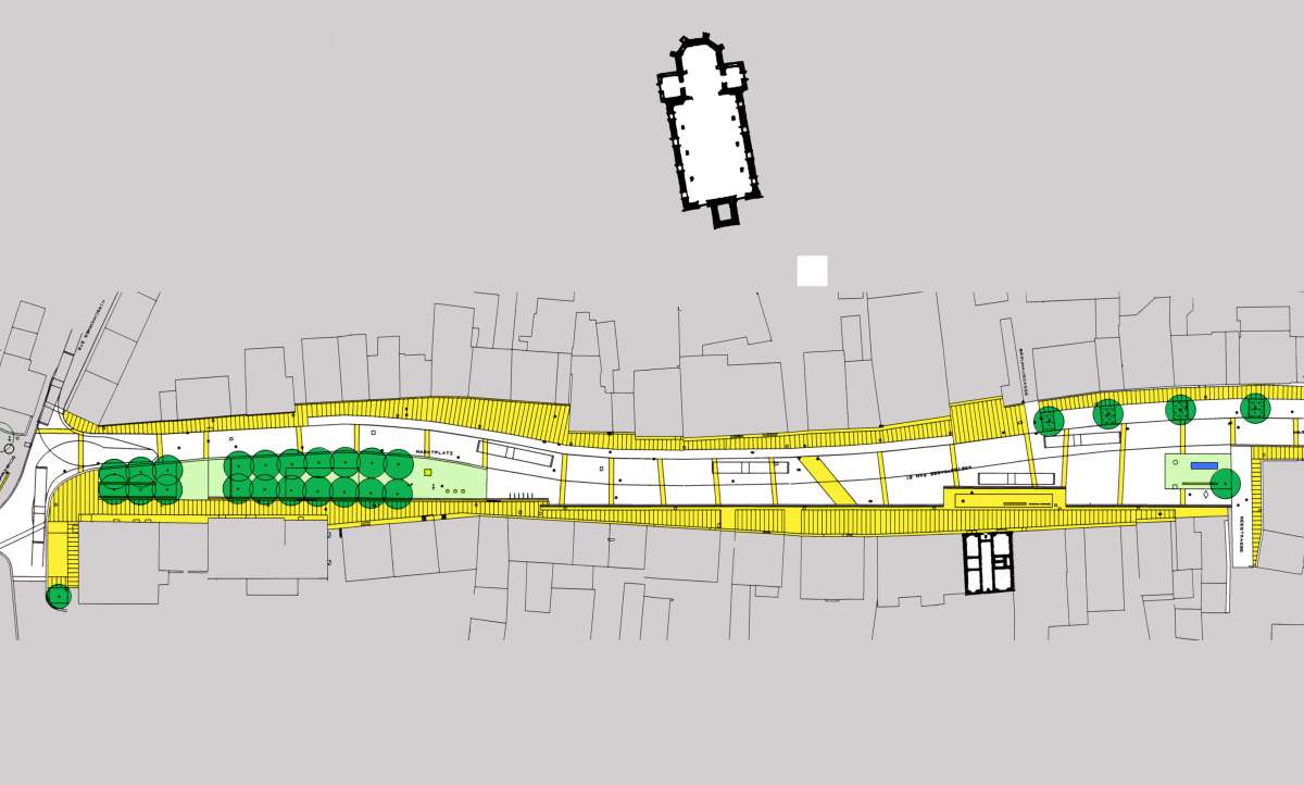 Unterschiedlich breite Zonen aus großen hellen Betonplatten schaffen ausreichende Aufenthalts- und Begegnungsflächen vor den Häusern. Rhythmisch eingelegte Streifen verbinden die Seitenzonen optisch miteinander, die Zwischenfelder sind mit glattem Asphalt ausgefüllt. Bei Verwendung neuzeitlicher Materialien gelingt es so, den Charakter der Platzfläche zu erhalten, durch die rhythmische Gliederung der Verkehrsfläche die Geschwindigkeit des Verkehrs zu dämpfen und die aktuellen Anforderungen an einen barrierefreien und geräuscharmen Ausbau zu erfüllen. Die unterschiedlichen Flächen für Fußgänger, Fahr- und Parkverkehr werden mit wenigen Leitlinien ausreichend verdeutlicht. An der Stelle der historischen Platzverengung ist ein grüner baumbestandener Anger angelegt. Die Bushaltestelle vor dem Rathaus ist als Kap ausgebildet. Die breite und teilweise überdachte Fläche kann vielseitig genutzt werden.