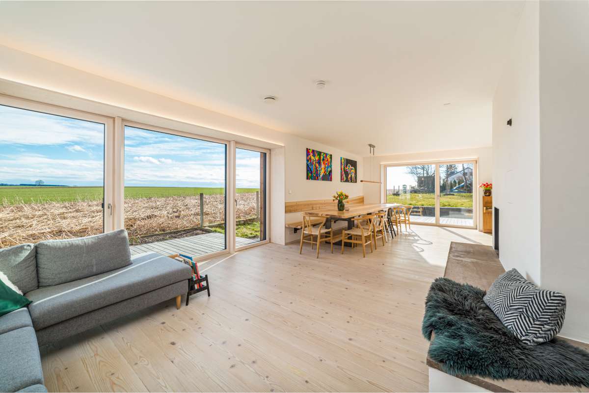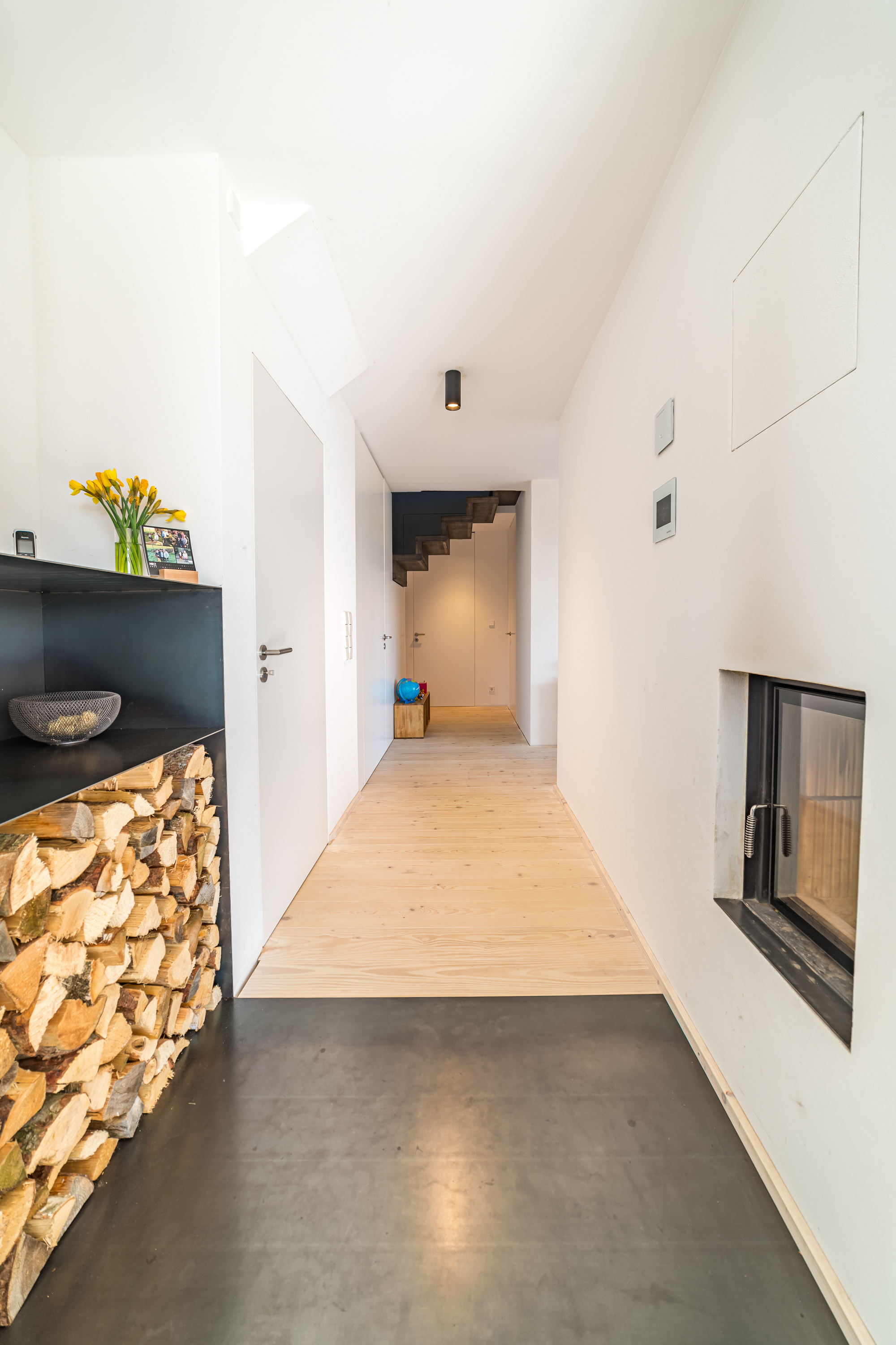 Durch das Entfernen von nichttragenden Innenwänden und das Verlegen von Eingang und Treppe entstand im Erdgeschoss eine zusammenhängende Wohnlandschaft, in der Blickbeziehungen in ganzer Gebäudebreite und -länge möglich werden. Das Entfernen von nichttragenden Türstürzen und die Ausbildung raumhoher Türen unterstützt diese Großzügigkeit. Im Obergeschoss prägen die beiden Gauben den Raum, es entsteht ein lichtdurchfluteter Bereich mit Blick auf die Berggipfel der Alpen.