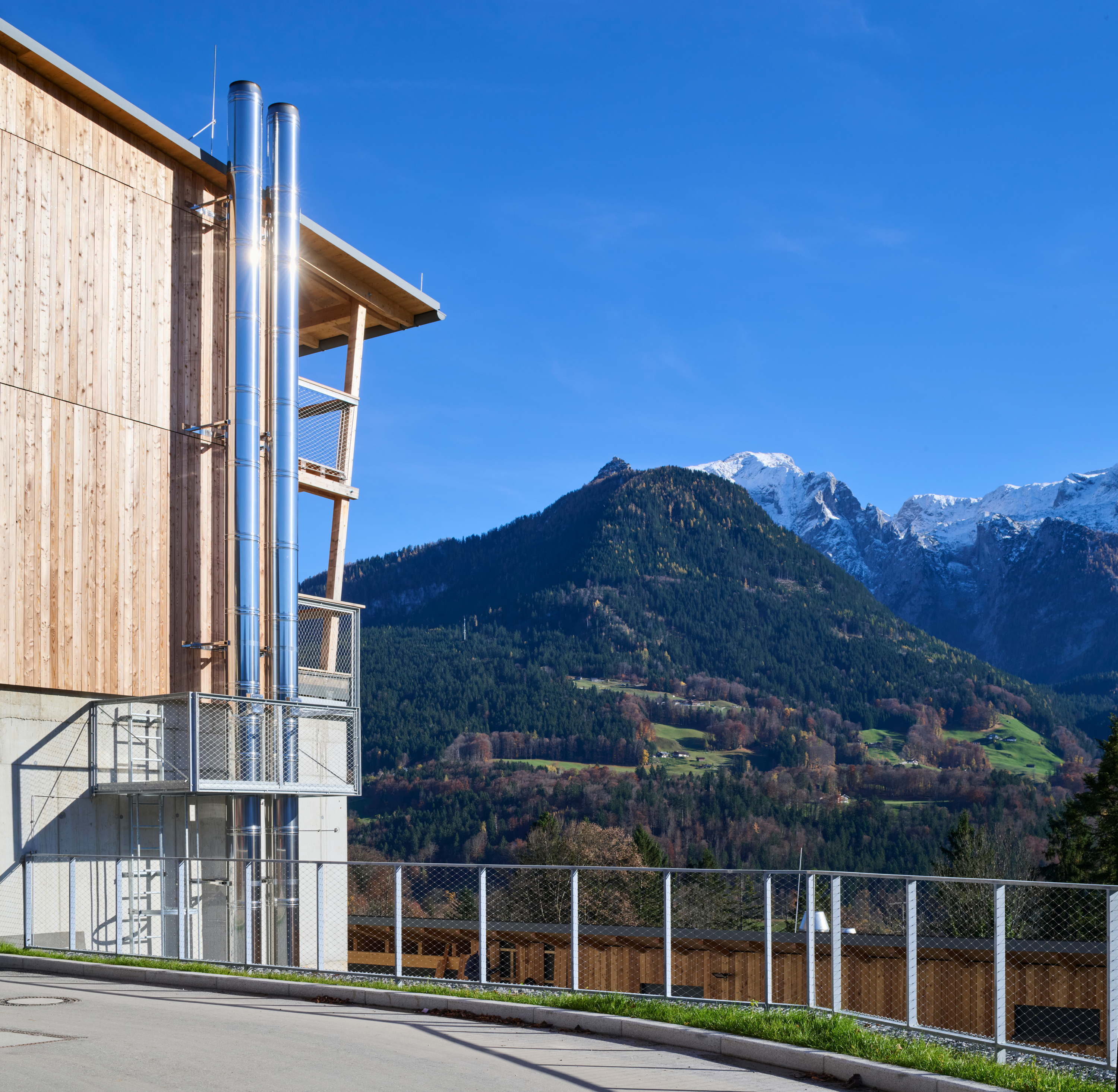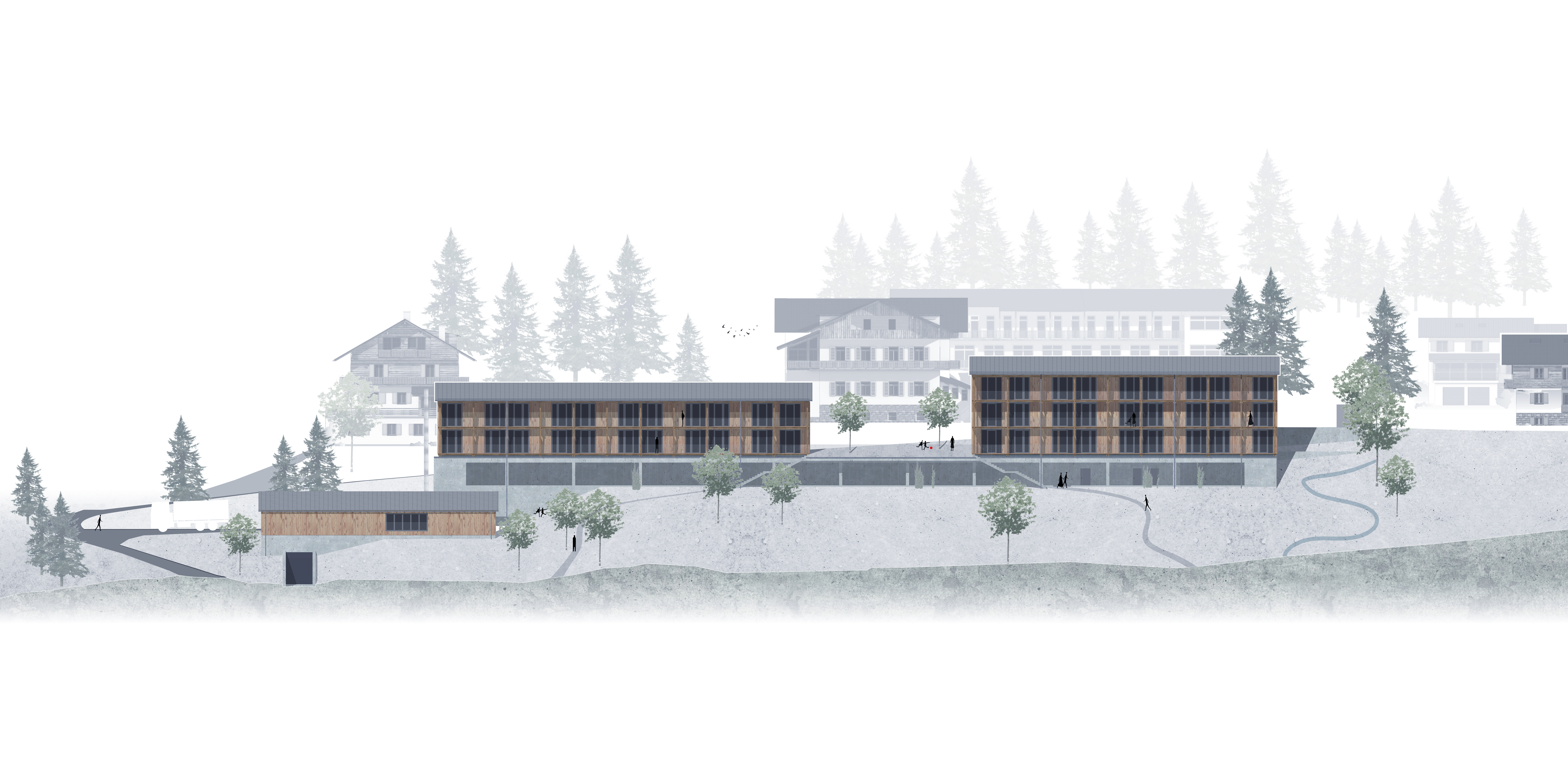 Um für die Sanierung im laufenden Betrieb räumliche Kapazitäten zu schaffen, wurden zunächst die notwendigen Erweiterungsbauten realisiert. Auf einem in den Hang geschobenen Parkdeck entstanden zwei neue Bettenhäuser mit 44 Patientenzimmern, jeweils für Kinder mit Elternteil und zur Aussicht in die Bergwelt orientiert. Ergänzend wurden eine Wäscherei, Werkhof und Räume für Hausmeister sowie eine Heizanlage zur nachhaltigen Nahwärmeversorgung von Klinik und umgebender Nachbarschaft errichtet.